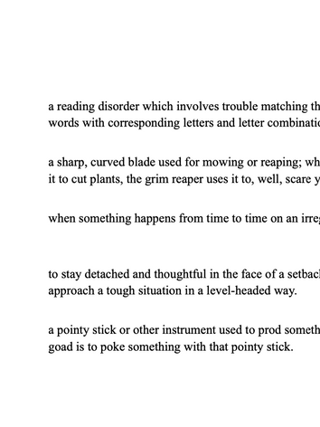 In addition to comprehension quizzes, students were given vocabulary quizzes on most Fridays. Vocabulary was frontloaded at the beginning of each week using words they would come across in the novel.